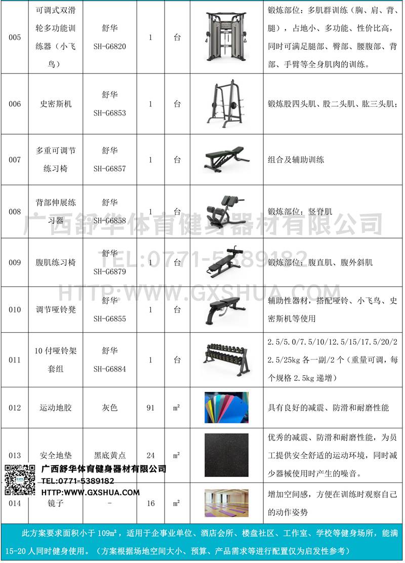 此方案要求面积小于109m²,适用于企事业单位、酒店会所、楼盘社区、工作室、学校等健身场所,能满15-20人同时健身使用。(方案根据场地空间大小、预算、产品需求等进行配置仅为启发性参考)